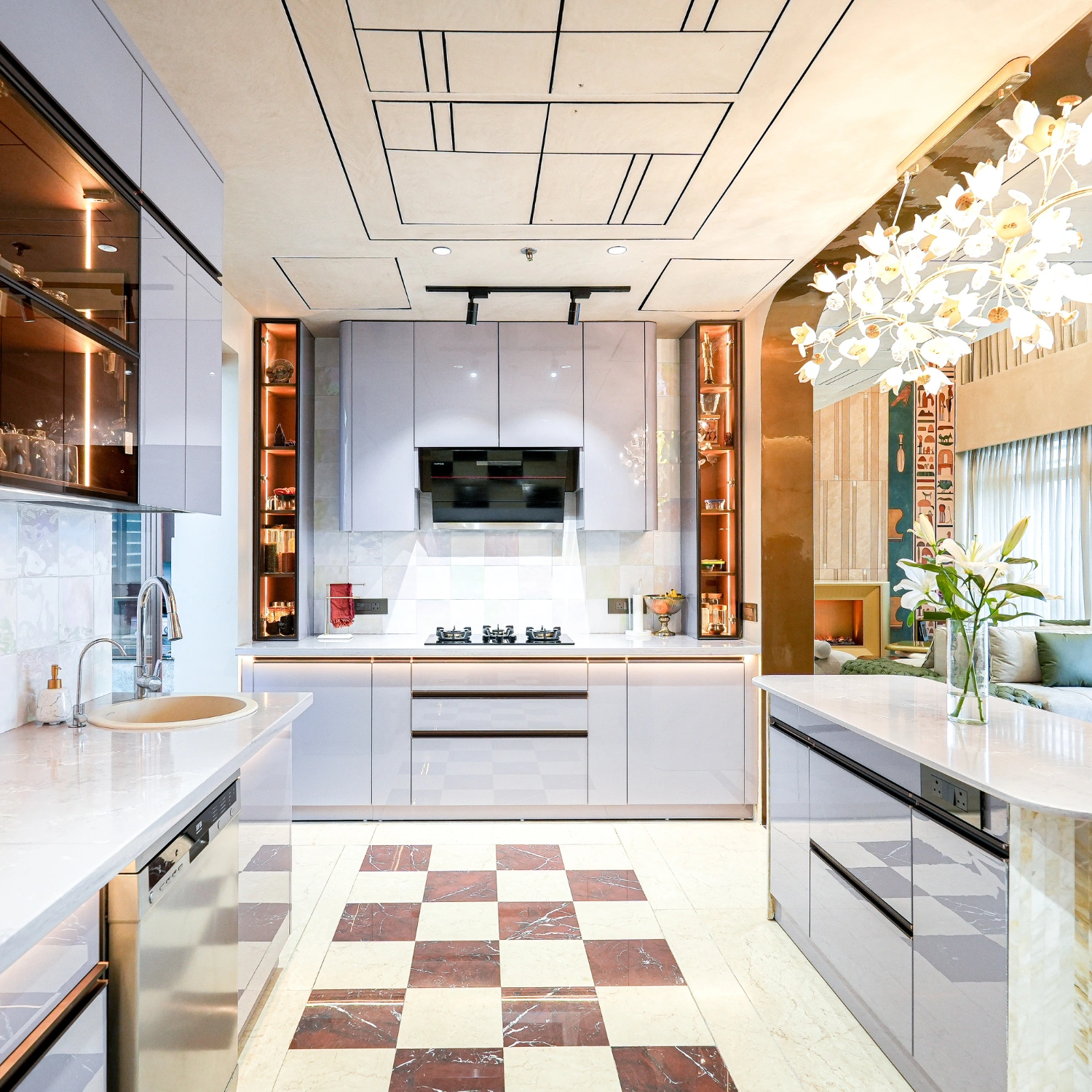 Bespoke dining zones with integrated entertainment and display shelves for sophisticated, organized meals.